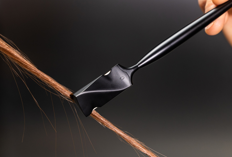 Traditional cutting tools can often compromise the integrity of hair extensions, particularly at the ends, leading to blunt finishes or reduced movement. The Calligraphy pen introduces a unique angled cutting technique designed to create softer, more natural-looking finishes, enhance movement, reduce stress on the hair structure, and improve the blend between natural hair and extensions.