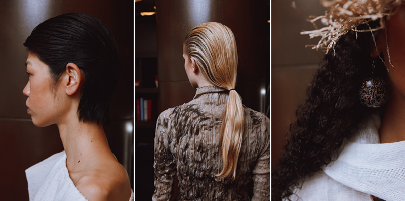 As the models turn their heads the direction of the comb marks sweeps down the head and blur together as the texture changes from wet look to dry and the movement changes from purposeful to organic as the hair dries.
