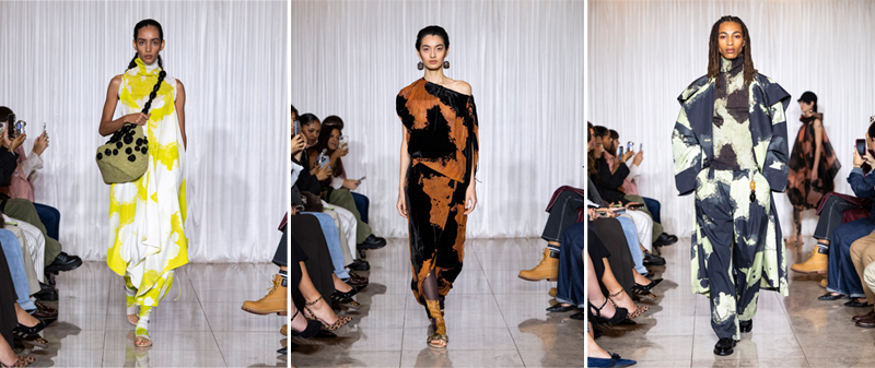 Rory William Docherty’s latest collection is inspired by underwater glimpses of Aotearoa New Zealand’s rugged, ranging coastline – with hints of rocky outcrops, sea grass and sea anemones forming from ink-drop and sketched prints and polished hand-sewn beads. The collection was a refined harmony of “the practical and the poetic”.