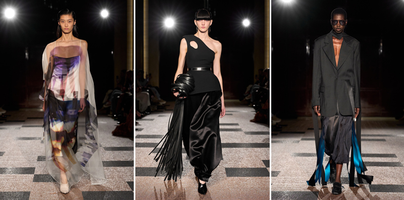 Hair was designed with a duality of organic and sculptural elements: real textures layered with directional forms, deep side partings sweeping across the face, and floating loops adding lightness and dimension. Set in the year 5202, the show imagined a world carried forward thousands of years into the future – the models’ hair intentionally messy and textured, as if altered by the distortions of time travel.
