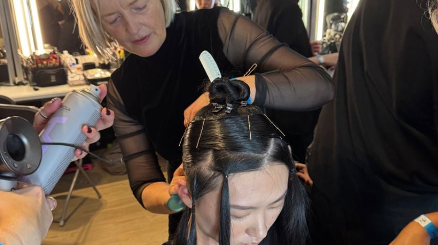 The look was built on precision. Sections of hair were wrapped flat to the head, with zig-zag sections left out and folded in a crisscross pattern over the crown to finish. This striking juxtaposition balanced softness and strength, echoing the tension within the collection itself.