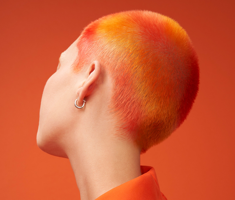 - For a pumpkin orange colour, it’s important with formulation to mix lots of different shades together to create a really seamless look, especially when blending on buzzed hair. For this look, I started with one shade and then added more pigment to the same bowl as I went through the hair. This allows for creative control and allows you to adapt the shade as you move through the technique.